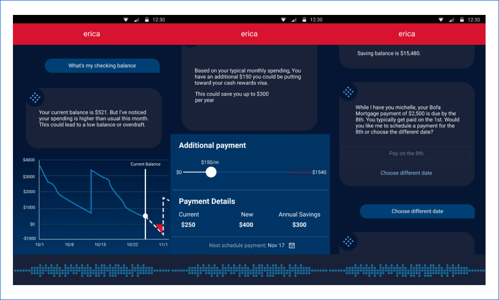 In October 2016, both Bank of America and MasterCard introduced their chatbots, Erica and Kai, respectively. These allowed customers to ask questions about their accounts, initiate transactions and receive advice via Facebook Messenger of Amazon’s Echo tower. Michelle Moore, the head of digital banking at Bank of America declared, “What will banking be in two, three or four years? It’s going to be this.”