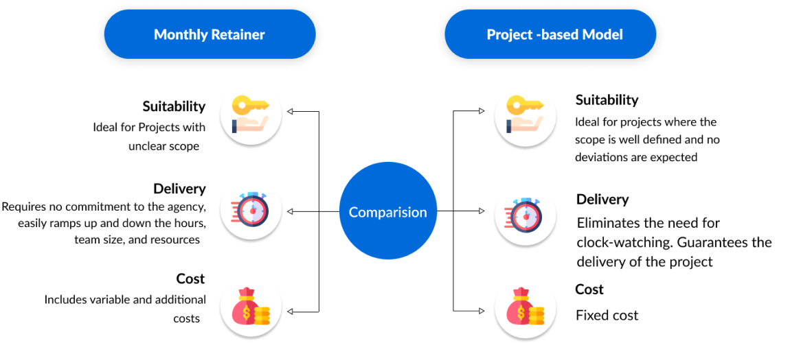 This is a fixed model in which a business is charged a fixed sum for the pre-defined scope during a period of the project. This type of engagement is very useful for businesses when there is no deviation in the scope of the project.
