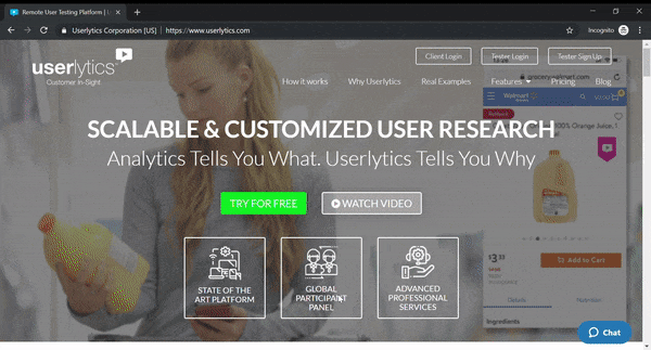 Being an advanced user testing platform, Userlytics needed to capture the qualitative and quantitative user experience data of participants by recording the screen, audio, webcam in a “Picture-in-Picture” format with metrics such as time on task, ease of use, success or failure, and more.
